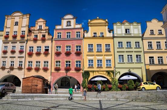In Laubengängen kannst du um den gesamten Marktplatz wandeln. Die Häuser stammen aus dem 17.und 18.Jh. Leider verloren sie bei Restaurierungen in den 1960er-Jahren ihren reichen plastischen Schmuck. Das Rathaus in der Mitte des Marktes (in Schlesien nennt man diese rechteckig angelegten Plätze rynek, Ring) entstand 1744–49, der Neptunbrunnen im 19.Jh. als Symbol für den einstigen Überseehandel der Stadt, die durch das Tuchgeschäft zu Reichtum kam.