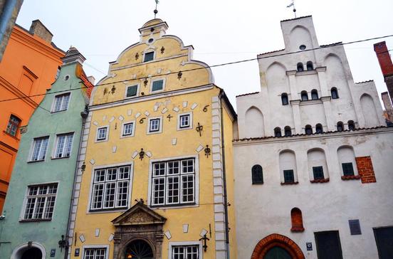 Geschwister sind diese drei Giebelhäuser eigentlich nicht. Auch wenn sie sich so schön aneinanderlehnen – sie entstanden zu ganz verschiedenen Zeiten. Das Haus Nr. 17 mit dem gotischen Stufengiebel ganz rechts stammt aus dem 15.Jh. und ist sozusagen der „große Bruder“, es gilt als Rīgas ältestes Wohnhaus. Der gelbe Giebel in der Mitte dagegen trägt Züge holländischen Barocks und die Jahreszahl 1646.Der Bruder Nr. 19 links stammt aus dem 18.Jh., hier ist das lettische Architekturmuseum untergebracht.