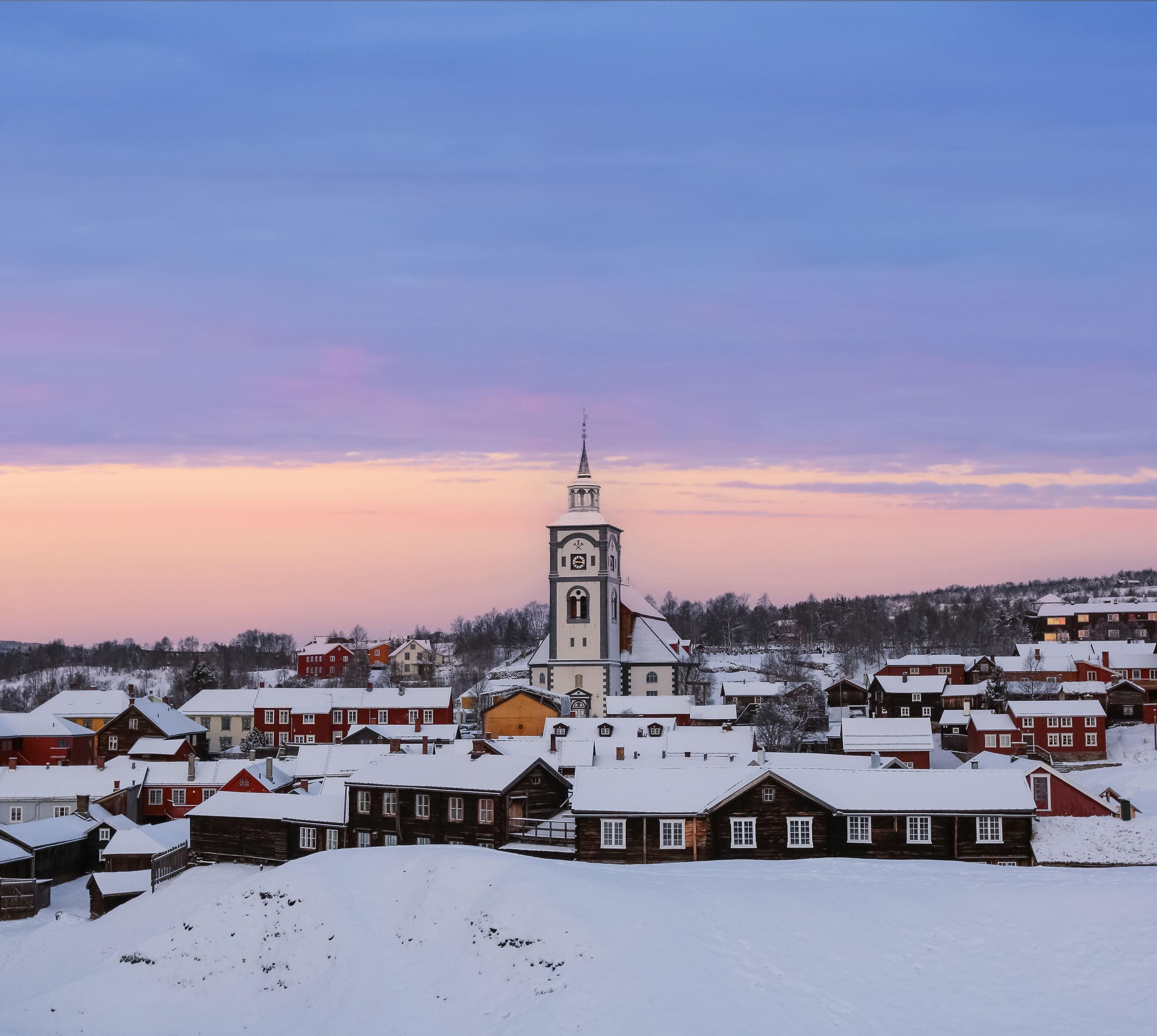 In der ehemaligen Kupferbergbaustadt nahe der schwedischen Grenze scheint die Zeit stehen geblieben zu sein. In den zwei Hauptstraßen reihen sich rund 50 denkmalgeschützte Häuser aneinander, überragt von der Kirche, dem einzigen Steingebäude weit und breit. Røros ist ein Winterferienort: Die Temperaturen können auf -30 °C fallen, doch in dem trockenen Binnenklima ist eine Schlittenfahrt ein tolles Erlebnis.