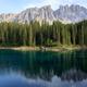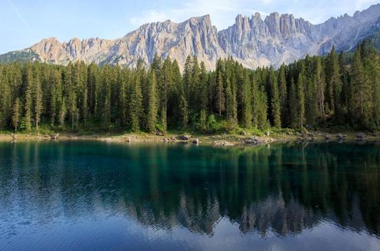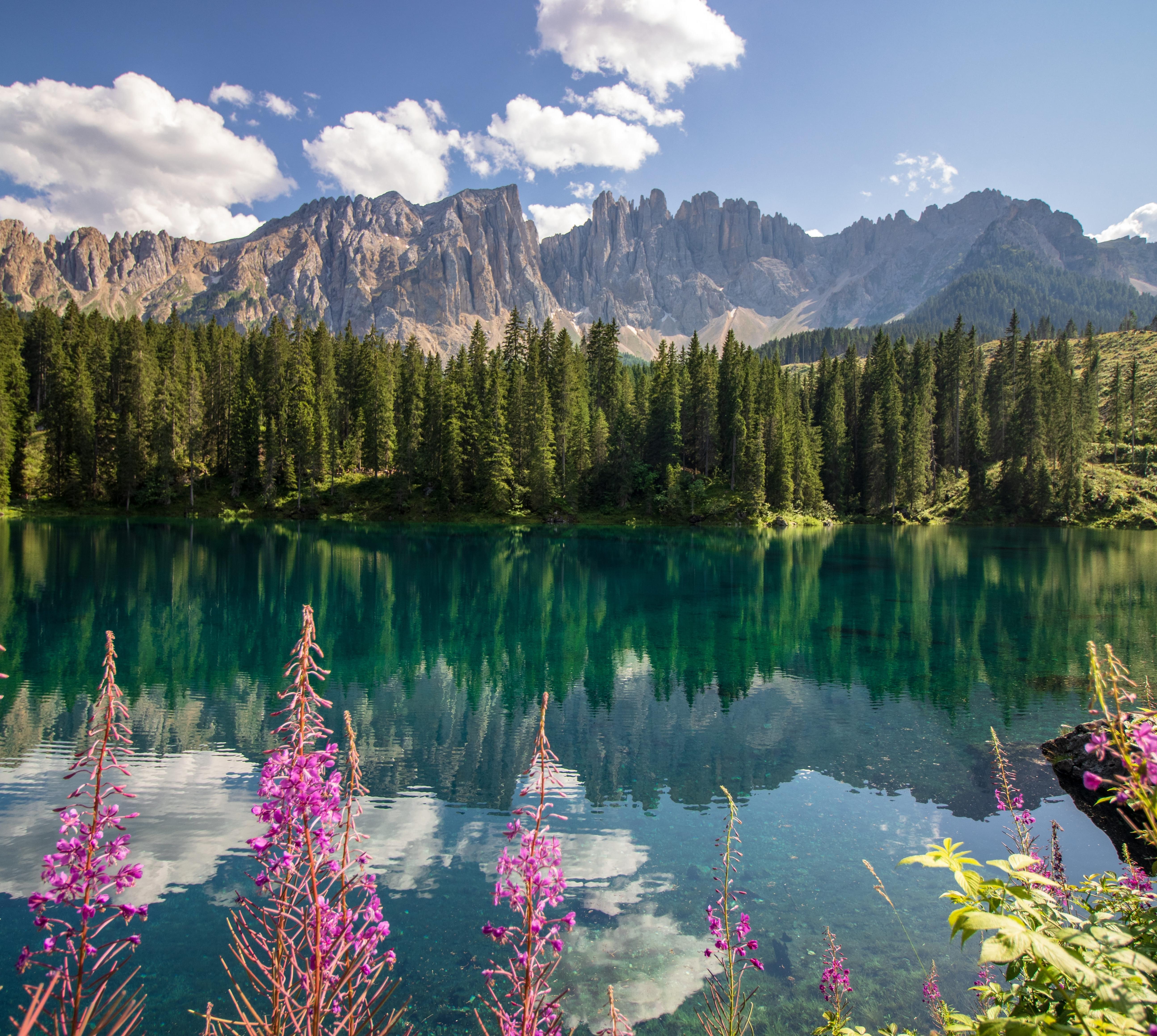 Der Karersee liefert ein beliebtes Fotomotiv: türkisfarbenes Wasser von dunkelgrünem Wald gesäumt, hinter dem sich die bizarren Zacken der Latemar-Gebirgskette erheben. In der Nähe befindet sich auf 1600 m Höhe ein Golfplatz, der bereits Anfang des 20.Jhs. vom europäischen Adel geschätzt wurde.