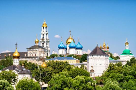 Erstaunlicherweise gibt es in unmittelbarer Nähe zur Millionenstadt noch Fleckchen von ländlicher Ruhe und Abgeschiedenheit. Wallfahrtsort und Ausflugsziel vor den Toren Moskaus ist das Dreifaltigkeits-Sergios-Kloster mit seinen Zwiebeltürmen in Sergijew Possad, früher auch Sagorsk genannt. Das Kloster ist bis heute das wichtigste geistliche Zentrum Russlands, vergleichbar mit dem Vatikan, obwohl die russisch-orthodoxe Kirche weniger zentralistisch aufgebaut ist. Seine blauen und goldenen Zwiebeltürme sind bereits aus großer Ferne zu sehen. Wenn man schließlich hinter den hohen Festungsmauern über den großen Klosterhof läuft, trifft man Schüler des Priesterseminars und der Akademie der russisch-orthodoxen Kirche in ihren schwarzen Soutanen. Zahlreiche Pilger drängen sich in der kleinen Dreifaltigkeitskathedrale von 1422 mit ihren goldenen Kuppeln und dem Grab des Heiligen Sergios. Babuschkas füllen sich in der Brunnenkapelle wundertätiges Wasser ab. Bis heute ist Sergijew Possad das erste und wichtigste unter den fünf Lawra- oder Einsiedlerklöstern der russisch-orthodoxen Kirche. Das symbolisiert auch die größte Kirchenglocke der Welt, welche rund 72 t schwer und 4,5 m hoch ist. Sie wurde 2004 neu auf dem 87 m hohen Glockenturm angebracht - der bereits 1761 errichtet worden war. Etwa um 1340 hatte der Bojarensohn Sergios von Radonesch sich in den einsamen Wäldern nördlich von Moskau eine Mönchsklause und eine kleine Holzkapelle errichtet. Schnell scharten sich Anhänger um ihn. Von hier aus feuerte Sergios den Widerstand gegen die Goldene Horde der Mongolen an und ließ das Kloster befestigen. In der "Zeit der Wirren" um 1600 konnten polnische Truppen zwar Moskau erobern, nicht jedoch das Wehrkloster einnehmen. Eine 16 Monate lange Belagerung scheiterte. Die Volkshelden Kusma Minin und Dmitri Poscharski, deren Denkmal auf dem Roten Platz steht, konnten von der Klosterstadt aus schließlich die Befreiung der Stadt organisieren. Für die Zaren der Romanow-Dynastie, die danach auf den russischen Thron gehoben wurden, war das Kloster seitdem ein wichtiger Wallfahrtsort. Der junge Zar Peter der Große fand hier 1688 Zuflucht vor der aufständischen Strelitzengarde. 1919 wurde das Kloster aufgelöst, 1946 aber von Stalin an die Kirche zurückgegeben. Von 1946 bis 1988 war es im Anschluss Sitz des Patriarchen der russisch-orthodoxen Kirche, bevor dieser erst nach Peredelkino ging und dann schließlich nach Moskau zurückkehrte. Noch heute beeindruckend ist die 12 m hohe, 6 m dicke und 1,5 km lange weiße Festungsmauer, die von den blauen, mit golden Sternen geschmückten Zwiebelkuppeln der Mariä-Entschlafungs-Kathedrale überragt wird, die Iwan der Schreckliche 1559 nach Moskauer Vorbild erbauen ließ. Hier liegt der unglückliche Zar Boris Godunow begraben. Kleiner, aber noch älter und bedeutsamer ist die Dreifaltigkeitskathedrale mit dem Grab des Klostergründers Sergios. Das Original der berühmten Dreifaltigkeitsikone des berühmten Malers Andrej Rubljow, der angeblich ein Schüler von Sergios gewesen sein soll, wird allerdings heute nicht mehr hier, sondern in der Tretjakow-Galerie im Zentrum Moskaus ausgestellt. In Sergijew Possad kann nur eine Kopie des bedeutenden Werks besichtigt werden. Priesterseminar und Akademie sind im ruhigen hinteren Bereich des Klosters im Rasthof der Zaren aus dem 17.Jh. untergebracht. Das Refektorium des Klosters mit einem 70 m langen Saal ist ein Geschenk Peters des Großen. Auf dem Gelände befindet sich auch ein sehr informatives Museum der Klostergeschichte. Souvenirs können überall gekauft werden.