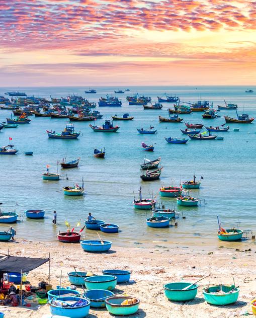 Die Lebensader des Südens sorgt mit ihren Seitenarmen, den „neun Drachen“, für stets volle Reisschüsseln – in der Reiskammer Vietnams. Das Kontrastprogramm: Saigon ist aufregend und laut, voll und verwirrend. Hat man die erste Hürde im Verkehrschaos erst einmal genommen und allein die Straße überquert – umspült vom endlos knatternden Zweiradstrom –, dann macht das Bummeln auch in Vietnams Skyscraper-City so richtig Spaß. Und manche Ecken sehen tatsächlich noch heute so aus wie zu Graham Greenes Zeiten in den 1950er-Jahren. Nach der (Sightseeing-)Pflicht folgt bekanntlich die Kür: Ausspannen und Sonnenbaden an den Stränden von Nha Trang und Phan Thiet/Mui Ne oder auf der Insel Phu Quoc – Urlaubsoasen aus feinem Sand, kristallklarem Meer und Kokospalmen.