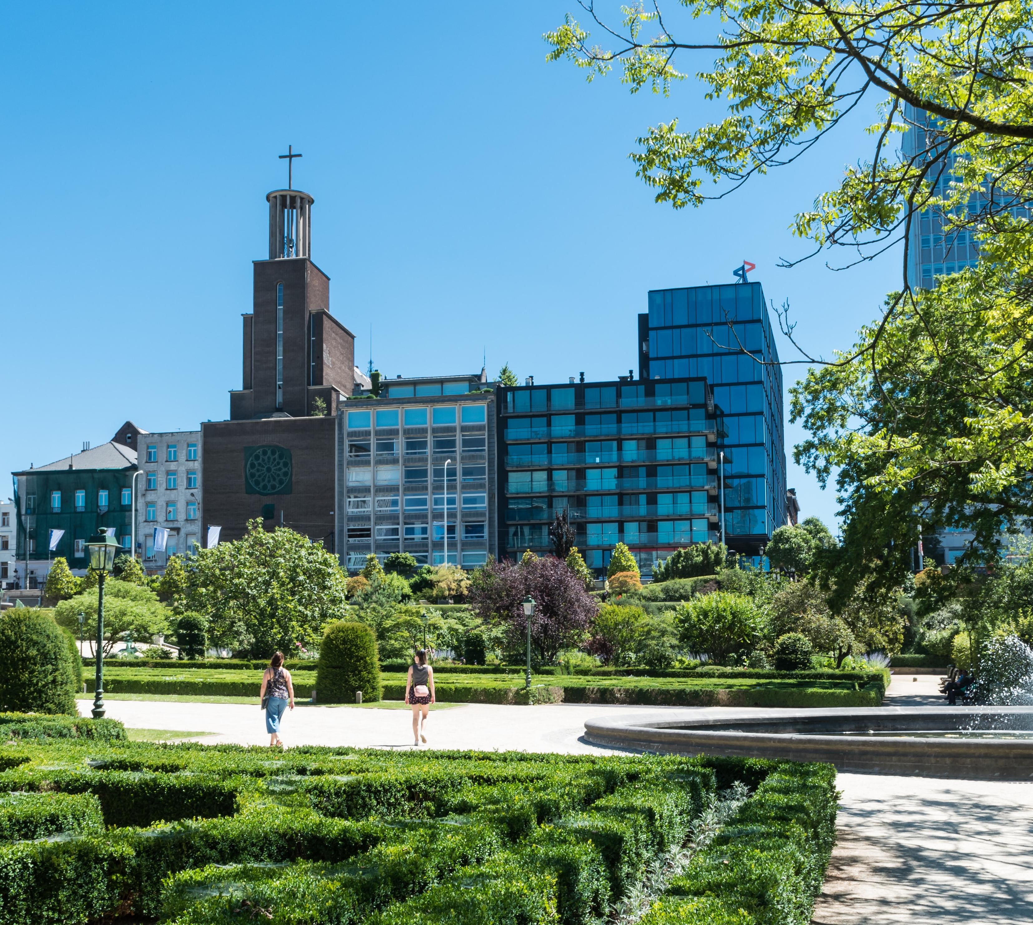 Hier erschließt sich Brüssels widersprüchliche Schönheit. Rechts das elegante, neoklassizistische Gewächshaus des alten Botanischen Gartens mit seinem Park, links ein Büroturm und ein glitzerndes Klein-Manhattan. In der Ferne schließt die Basilique Nationale eine lange Achse ab. Die kreuzende Achse der Rue Royale endet auf der einen Seite mit der neubyzantinischen Kirche Sainte-Marie, auf der anderen Seite mit dem Palast des Königs. Brüssels schönstes Fleckchen, wenn sich die untergehende Sonne im Glas des Gewächshauses spiegelt.