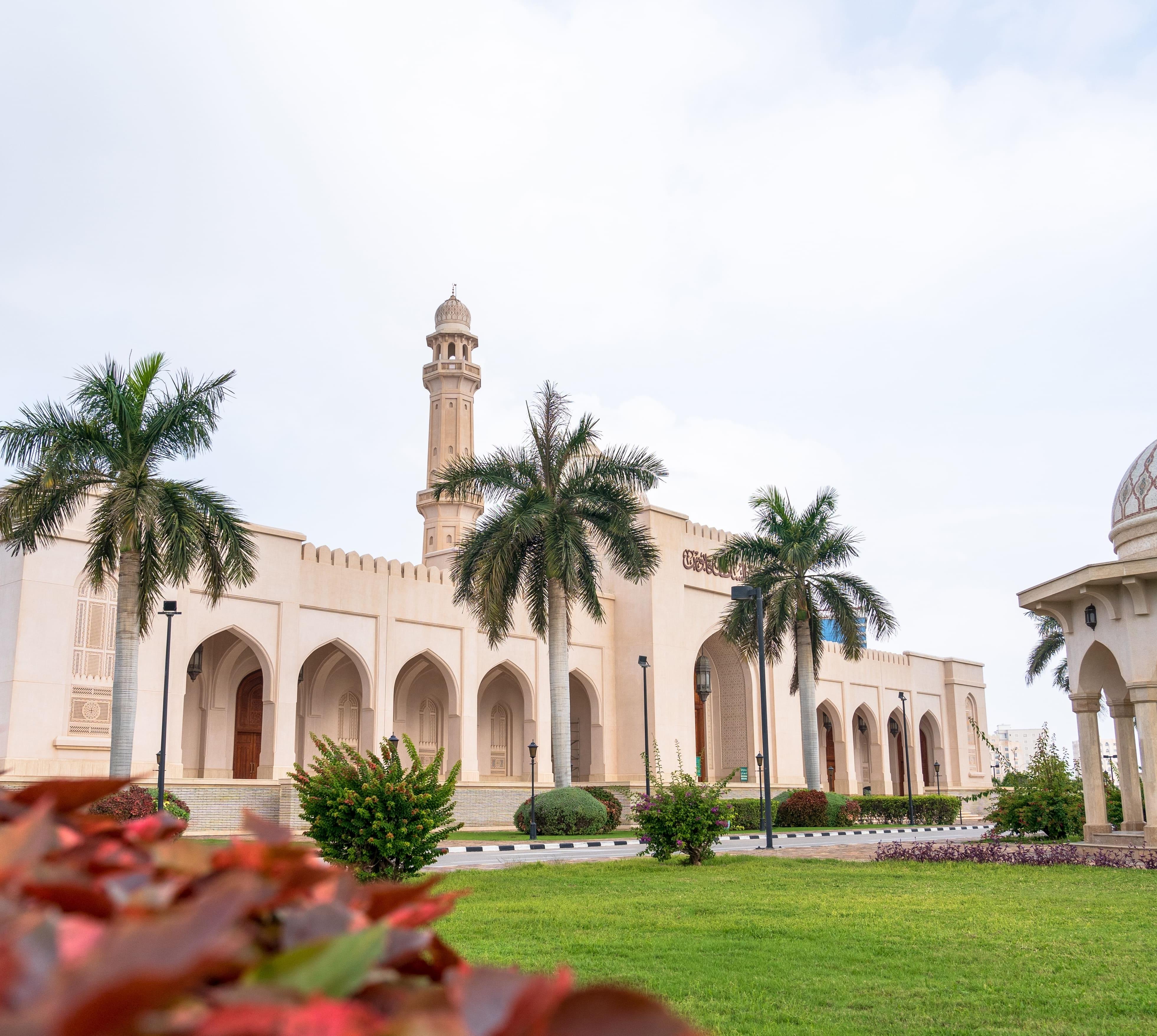 Sie ist längst nicht so groß wie ihr Pendant in Muscat, in dem 20 000 Gläubige Platz finden – hier sind es gerade mal 3200 Menschen. Ihr Interieur wirkt dafür nicht so überladen, sondern strahlt dank der hellen, freundlichen Farben vielmehr eine luftige Leichtigkeit aus. Dazu tragen auch die bunt bemalten Fenster bei, die viel natürliches Licht einlassen – so entsteht insgesamt eine einladende Atmosphäre, die zum Innehalten und Verweilen einlädt. Der separate Gebetsraum für die Frauen – die Ladies Prayer Hall – befindet sich auf der Nordseite der 2009 eingeweihten Moschee. Nichtmuslime beachten bitte die Kleiderordnung: lange Hosen für alle sowie langärmlige Oberbekleidung und Kopftuch für die Frauen.