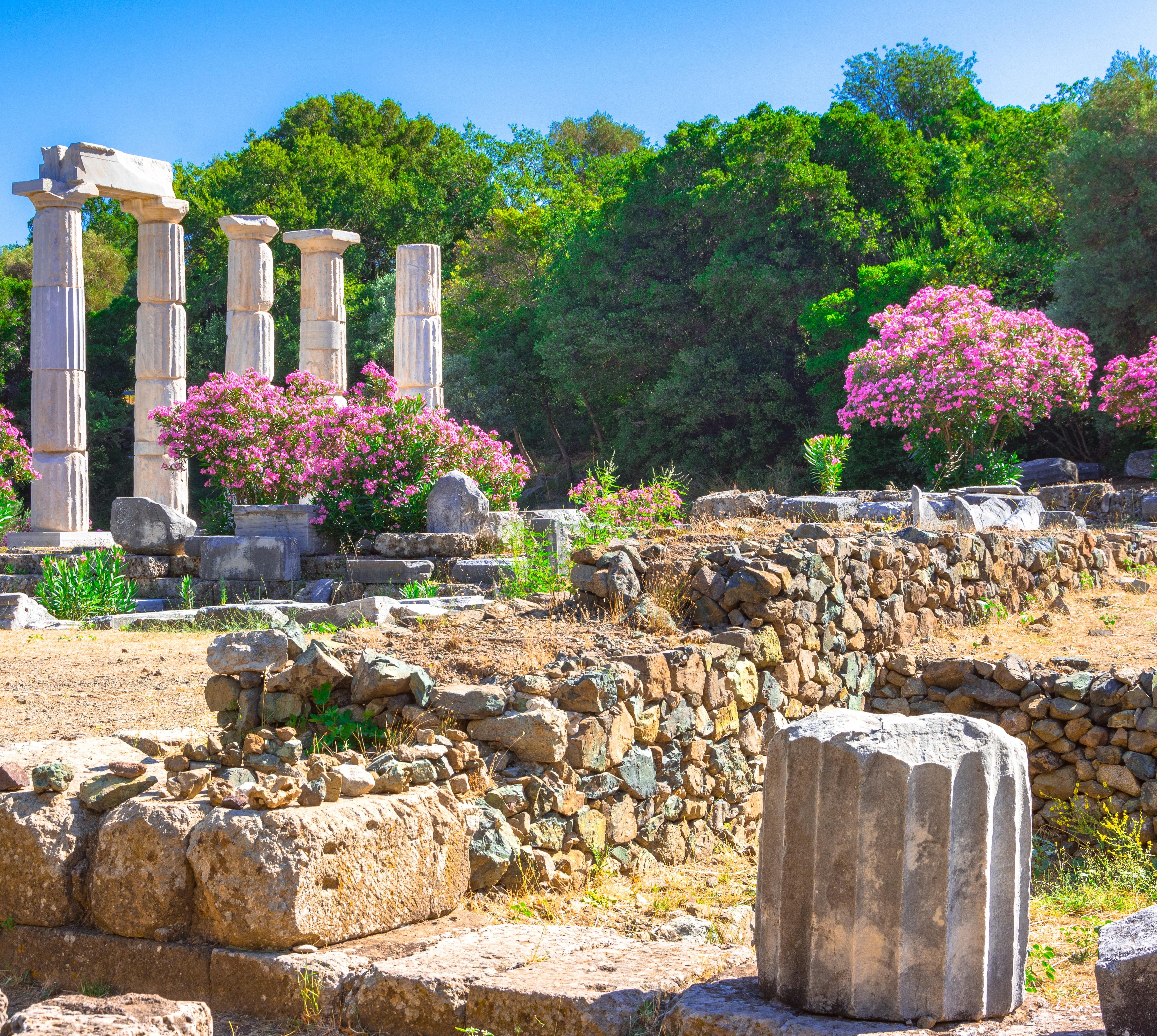 Aber genau das schätzen die Stammgäste: Sie lieben die Wildheit der Natur an den Hängen des 1611 m hohen Fengári-Gebirges. Einen schönen Ort gibt es auch – und eine archäologische Stätte, die verwunschen romantisch in wilder Einsamkeit liegt.