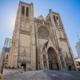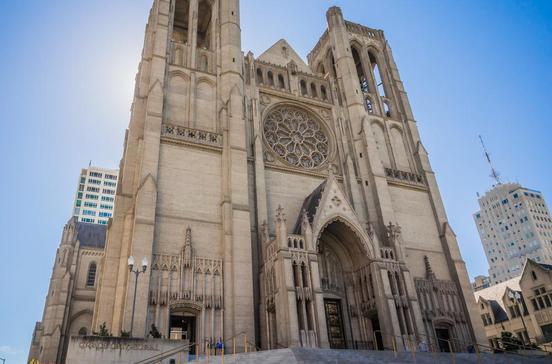 Notre Dame? Nein, Grace Cathedral, eine neugotische Nachahmung mit einem wunderschönen, nachts von innen angestrahlten Rosettenfenster, das 1970 im französischen Chartres angefertigt wurde. Grace Cathedral ist der Bischofssitz der Episcopal Church, einer der wichtigsten protestantischen Gemeinden in den Vereinigten Staaten.