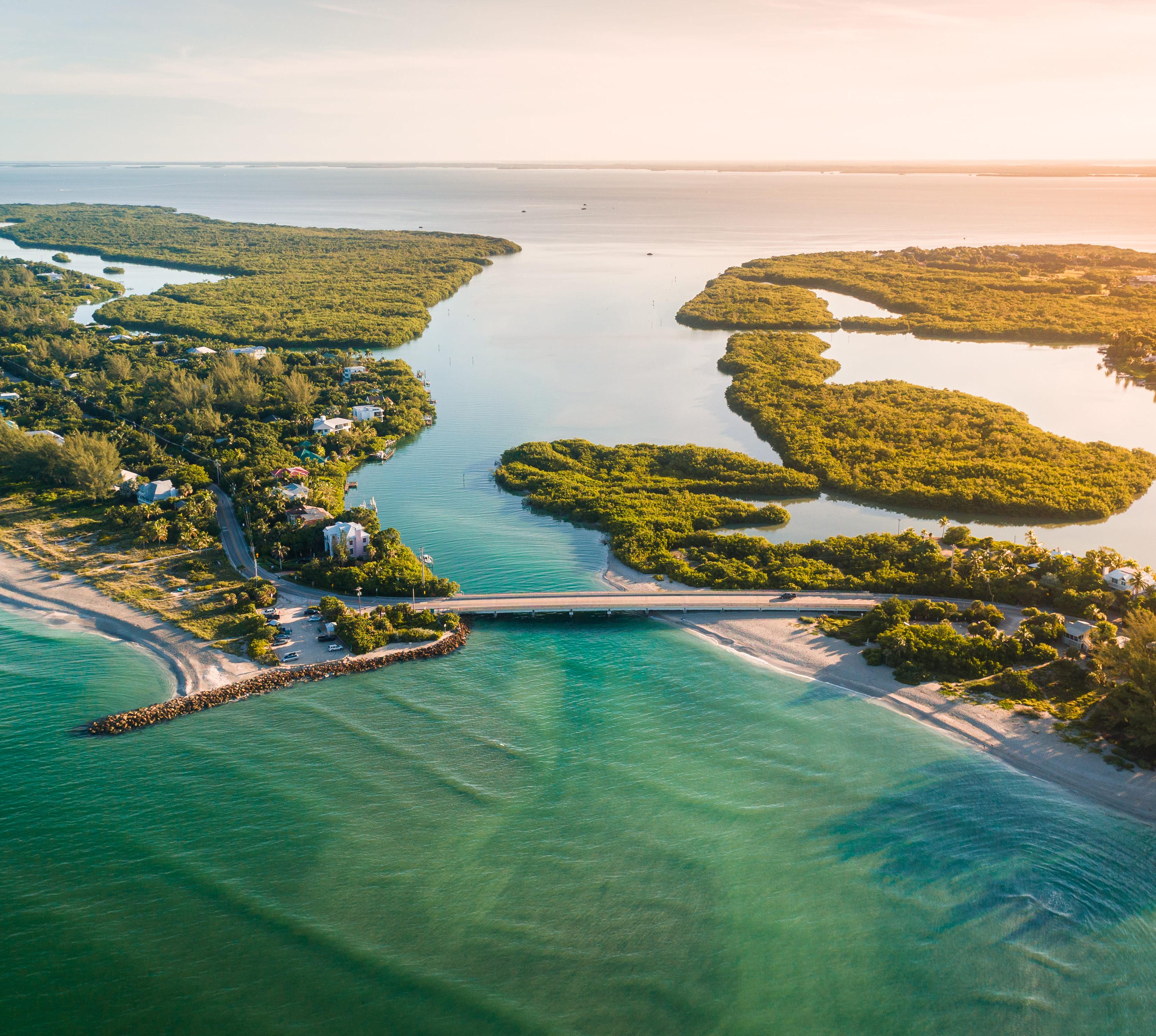 40 Prozent der vielleicht schönsten Golf-Inseln stehen unter Naturschutz. Die tollsten Strände sind der völlig unverbaute Bowman’s Beach, der sich kilometerlang in seiner ursprünglich Form entfalten darf, sowie der Captiva Beach, wo Besucher Tag für Tag den Sonnenuntergang beklatschen. Erst seit 1963 sind die Inseln per Brücke ans Festland angeschlossen, 2022 ließ Hurrikan Ian sie einstürzen, Anfang 2023 wurde sie neu eröffnet. Der Zugang aber bleibt exklusiv, denn die Passage über die gebührenpflichtige Brücke kostet aus Richtung Fort Myers jedes Mal 6 $ pro Auto. Auf den Inseln sind die Folgen der Stürme weiterhin spürbar, viele Lokale arbeiten noch am Wiederaufbau.