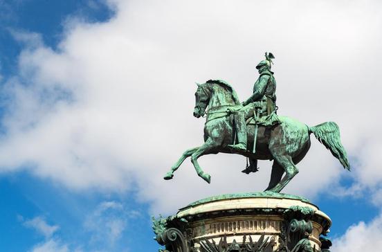 Das bekannteste Wahrzeichen Sankt Petersburgs bildet den Mittelpunkt des grünen Dekabristenplatzes: der Eherne Reiter. Das Denkmal für Peter den Großen zeigt den Stadtgründer als dynamischen Visionär, der auf seinem sich aufbäumenden Pferd zum großen Sprung nach vorn ansetzt. Das Werk des Franzosen Etienne Falconet wäre nur halb so attraktiv, stünde es nicht auf dem wie eine mächtige Woge geformten Sockel. Ursprünglich war dies ein 1600 t schwerer Felsblock, der 12 km entfernt lag. Zu seinem Transport baute man eigens einen Katamaran aus zwei Segelschiffen. Den Namen "Eherner Reiter" erhielt das Denkmal 1833 durch ein Gedicht Puschkins, in dem Ross und Reiter lebendig werden. Auf Russisch heißt er übrigens "Kupferner Reiter" - dabei ist die Statue in Wirklichkeit aus Bronze.