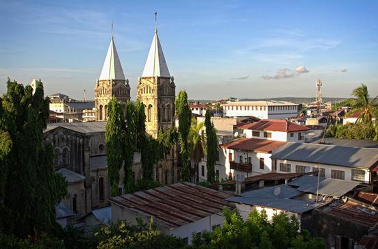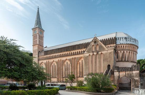Wo heute die imposante Kathedrale mit zinnenbewehrtem Dach und einem der höchsten Türme der Insel steht, befand sich seit dem 18.Jh. Sansibars Sklavenmarkt. Noch im 19.Jh. wurden etwa 600 000 Afrikaner von Stone Town in den Orient verschifft, bis der Sklavenhandel 1873 verboten wurde. Eine Gruppe von Missionaren ergriff die Gelegenheit, kaufte Grund und Boden und begann mit dem Bau einer Kathedrale. Im ehemaligen Missionsspital gleich neben der Kirche (heute ein Hostel) können die ehemaligenr Sklavenkerker besichtigt werden.
