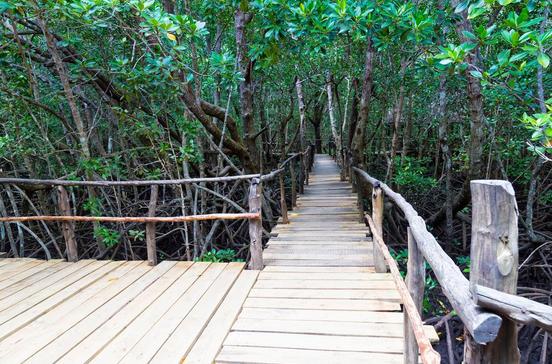In diesem letzten tropischen Urwald der Insel kann man erahnen, wie das Binnenland Sansibars einmal aussah: grün und dicht bewaldet. Nach Jahrzehnten kommerzieller Abholzung ist davon leider nicht mehr viel übrig geblieben. Forscher vermuten, dass im Park mehrere endemische Tierarten leben, wie etwa der Rotkopf-Guereza und andere Affenarten. Daneben leben auf dem Areal an die 40 Vogelarten, kleine Antilopen und Buschschweine. Ein Knüppelsteg führt durch die dichten Mangrovenwälder, so dass du dieses einzigartige Habitat, das bei Flut unter Wasser steht, von oben beobachten kannst.