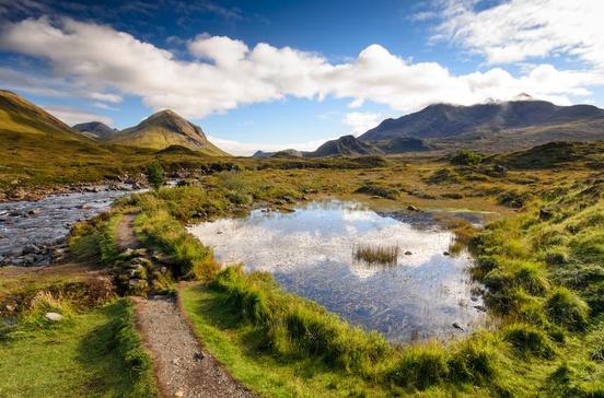 Wenn du inmitten der Berglandschaft der Cuillins baden magst, steuerst du von Sligachan in knapp 3 Stunden die Fairy Pools an, zauberhafte „Feen-Gumpen“. An der Straße von Carbost nach Glenbrittle gibt es nach 8 km einen gebührenpflichtigen Parkplatz nur 1 km vom magischen Schwimmerlebnis entfernt. Sligachan in der Inselmitte von Skye dient als Ausgangspunkt für Touren in die Red Cuillins, die einfacher zu begehen sind als die kletterintensiven Black Cuillins, deren höchster Berg der Sgurr Alasdair (993 m) ist. Sei vorsichtig: Wetter und Berge auf Skye werden oft total unterschätzt!