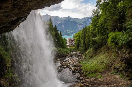 Beeindruckend stürzt sich der Giessbach in 14 Stufen rund 400 m in den Brienzersee. Man kann in 45 min. zur obersten der drei Brücken wandern und dort zuschauen, wie sich das Wasser in einen 6 m tiefen Felsenkessel ergießt.