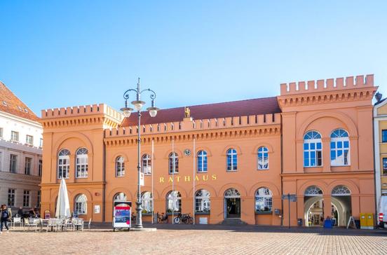 Das Altstädtische Rathaus an der Ostseite des Marktplatzes bekam 1835 von Demmler eine Schaufassade im Stil der Tudorgotik vorgesetzt. Auf den Zinnen reitet ein vergoldetes Abbild des Stadtgründers Heinrichs des Löwen. Von der Rückseite des Rathauses am Schlachtermarkt (ein Durchgang befindet sich linker Hand) ertönt jeden Mittag kurz nach 12 Uhr das Glockenspiel mit der Melodie von Mecklenburgs meistgesungenem Volkslied "Von Herrn Pastor sien Kauh".