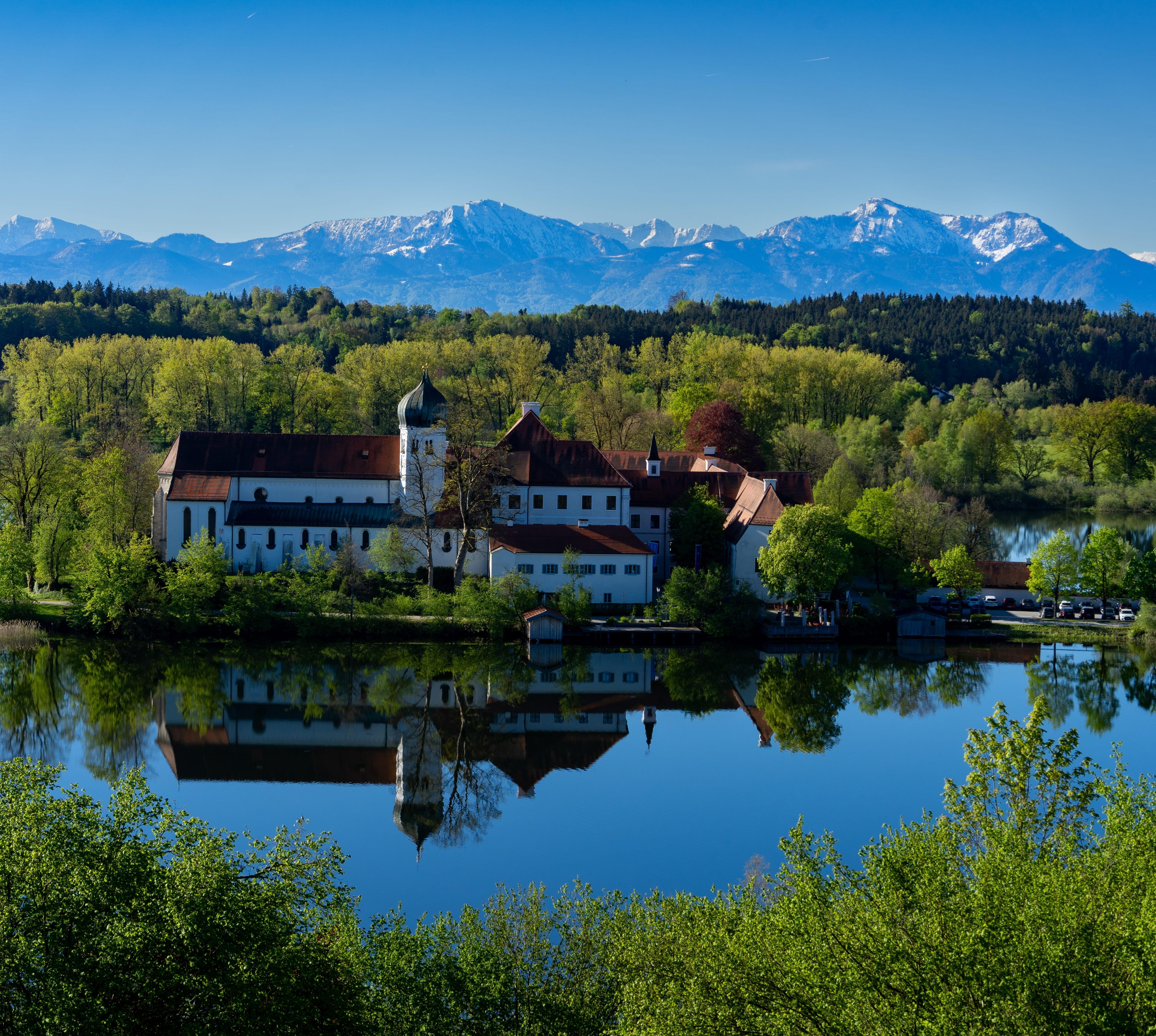 Dass das 8 km von Trostberg entfernte Benediktinerkloster bei seiner Gründung vor 1000 Jahren auf einer Insel im Seeoner See gestanden hat, lässt sich nur noch erahnen, denn die Verlandung hat die Insel zur Halbinsel gemacht. Erhalten geblieben sind die zweitürmige Kirche St. Lambert, ein schlichter Kreuzgang mit gotischen Gewölben und der weltabgeschiedene, stille Charme des Ensembles, dem schon Wolfgang Amadeus Mozart verfiel. Kirche, See und Holzsteg geben ein Idyll ab, wie man zauberhafter so schnell keines finden wird. Das im Kloster untergebrachte Kultur- und Bildungszentrum Oberbayerns richtet vor Ort emsig Ausstellungen und sehr schöne Konzerte aus.