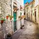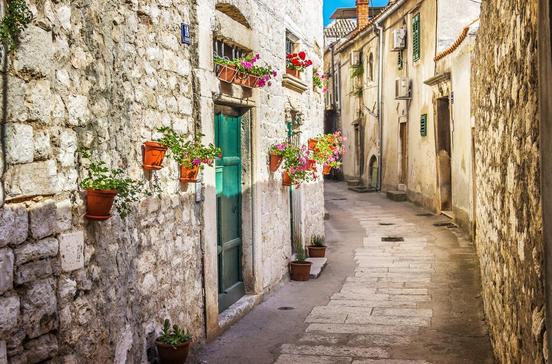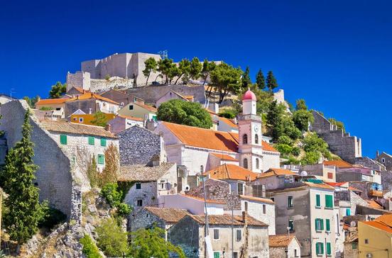 Winkelige Gassen führen zur Festungsruine Sv. Mihovil hinauf. Dies ist ein Weg, der sich lohnt, denn von hier eröffnet sich ein weiter Blick über die dicht gedrängten roten Ziegeldächer der Stadt bis ins grüne Tal der Krka.
