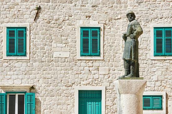Vor dem Hauptportal der Kathedrale Sv. Jakov steht das Dalmatinac-Denkmal, geschaffen vom wohl berühmtesten kroatischen Bildhauer des 20.Jhs., Ivan Meštrović.