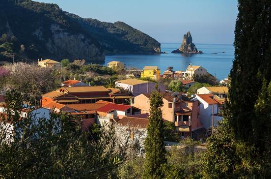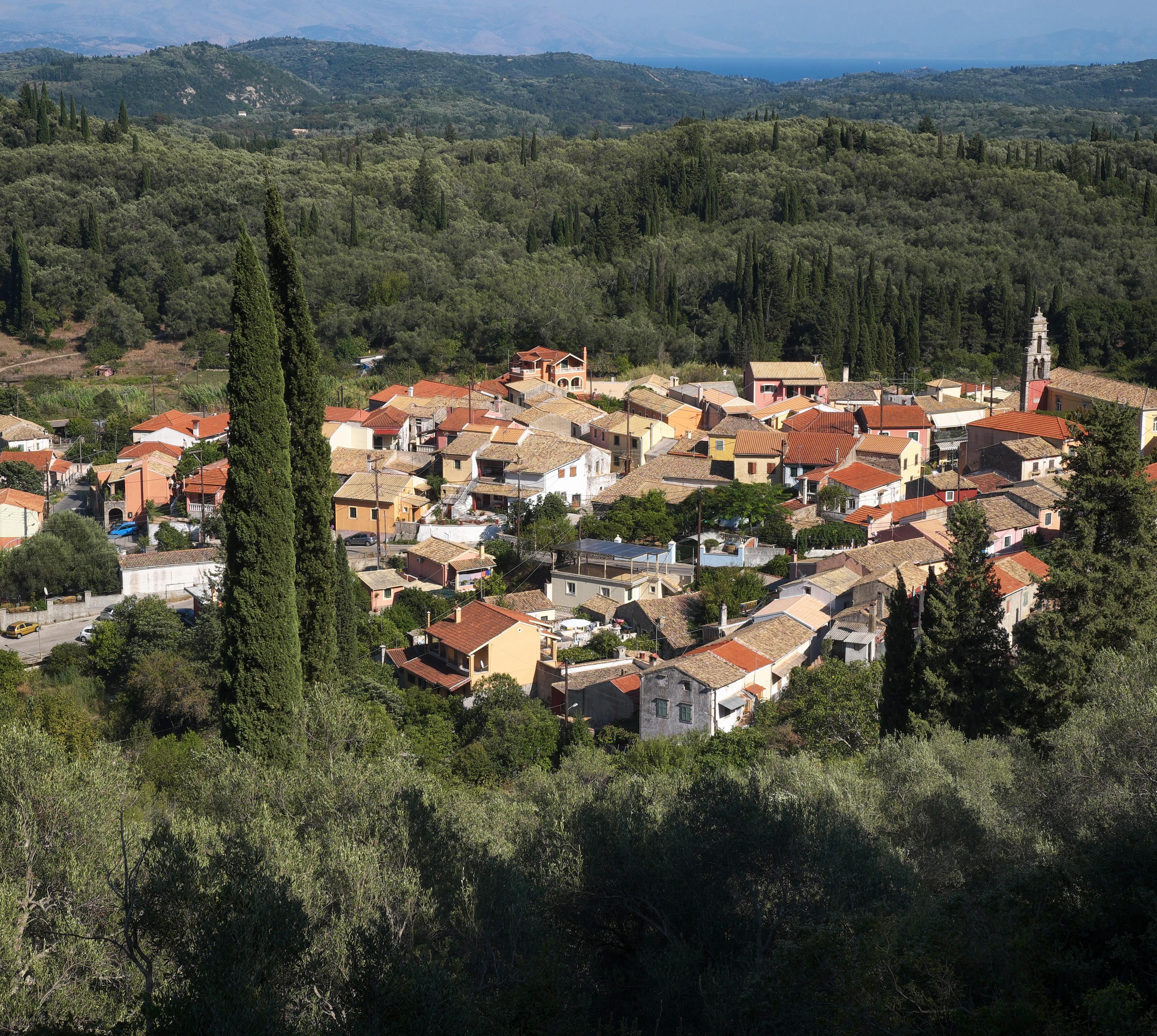 Das Dorf der "Zehn Heiligen" liegt hoch am Hang eines Bergs, der von einer weithin sichtbaren weißen Radarkuppel gekrönt wird. Vom Südende des Dorfs aus führt ein zu Beginn zementierter, 3,5 km langer und mit Jeeps befahrbarer Feldweg hinauf. Nur wenige Hundert Meter von der Radarkuppel entfernt liegt am anderen Ende der Hochebene das nur von Katzen bewohnte Kloster Pantokrátoras inmitten eines Gartens mit Feigen-, Walnuss- und Kirschbäumen. Ein paar Schritte oberhalb des Klosters steht eine moderne, dem Propheten Elías gewidmete Kapelle, von der aus sich ein großartiger Blick auf die Westküste Korfus und den Koríssion-See bietet.