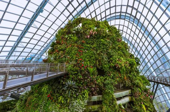 Die zwei Kuppelbauten, Flower Dome und Cloud Forest, beherbergen Gewächshäuser „verkehrt herum“: Denn sie kühlen statt zu wärmen. So überleben selbst Bäume aus den Alpen am Äquator. Das Spezialglas haben deutsche Wissenschaftler entwickelt. Und die hohen künstlichen Tropenbäume aus Stahl sollen nicht nur Spaß machen.