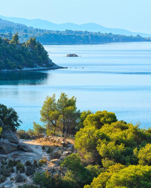 Der 50 km lange Mittelfinger der Chalkidikí ist wild, bietet viel unverbauten Freiraum. Das fast menschenleere Ítamos-Gebirge durchzieht die Halbinsel von Nord nach Süd, sein höchster Gipfel ist immerhin stolze 808 m hoch. Große Teile sind mit Kiefern bewachsen, weite Getreidefelder wie auf der Kassándra fehlen fast völlig. Viele Imker stellen in den Wäldern ihre Bienenstöcke auf. Sehr auffällig, besonders an der Ostküste, sind die großen mándra: einfache, meist kreisförmige Schaf- und Ziegenpferche mit Stallungen, in denen die Tiere von Oktober bis Anfang Juni gehalten werden. Im Sommer treiben die Bauern sie in die Berge. Landschaftlich grandios ist vor allem die Ostküste: Da hast du beim Baden fast immer den über 2000 m hohen Gipfel des Áthos vor Augen, der nahezu senkrecht aus der Ägäis aufsteigt.
