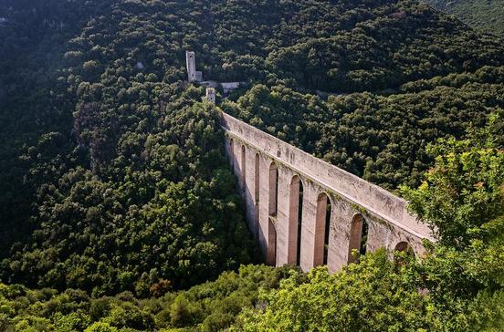 Die mächtige, 80 m hohe und 230 m breite Brücke mit ihren zehn hohen Bögen zeugt von mittelalterlicher Ingenieurskunst. Vermutlich an der Stelle eines römischen Aquäduktes erbaut, verbindet sie den Festungshügel Sant’Elia über das Tal des Tessino mit dem Berg Monteluco. Durch die einzige Fensteröffnung hast du einen herrlichen Blick.