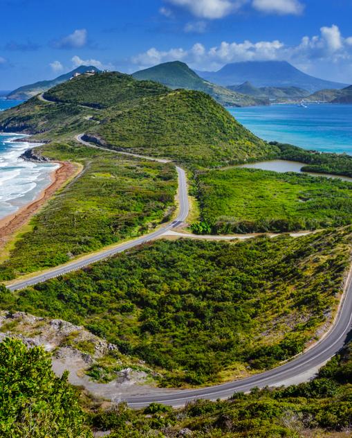 Grüne Zuckerrohrfelder ziehen sich von der Küste die Berge hinauf, weiße, mit Palmen besetzte Strände und verstreute Fischerdörfer säumen die Küste: Die Vulkaninsel St. Kitts, Hauptinsel von St. Kitts & Nevis, nannten die Ureinwohner Liamuiga – das heißt fruchtbares Land. Die Insel bietet einem ankommenden Kreuzfahrtschiff heute kaum ein anderes Bild, als es sich auch schon im 18.Jh. den Segelschiffen gezeigt haben mag. Nur dass aus den früheren Plantagenhäusern inzwischen noble Hotels geworden sind. Die gemächliche Hauptstadt Basseterre erinnert namentlich an die Zeit, als sich Franzosen und Engländer noch die Insel teilten und vereint am Bloody Point die einheimischen Kariben niedermetzelten, bevor sie sich dann gegenseitig bekriegten. Für einige Jahre hatte St. Kitts die Verwaltungshoheit über Anguilla und Montserrat. Seit 1983 ist St. Kitts & Nevis unabhängig; zum nur 3km weiter südlich gelegene Nevis verkehren Fähren.