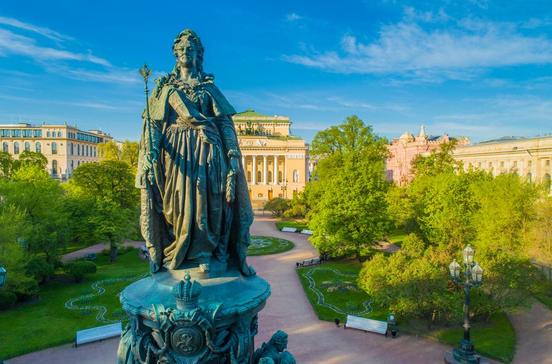 Das monumentale Denkmal für die langjährige Zarin Katharina II. wurde 1873 auf dem Platz vor dem Alexandrinski-Theater aufgestellt. Zu Füßen der mächtigen Herrscherin sitzt eine Herrenrunde aus Ratgebern und Favoriten wie Orlow, Potjomkin oder Suworow.