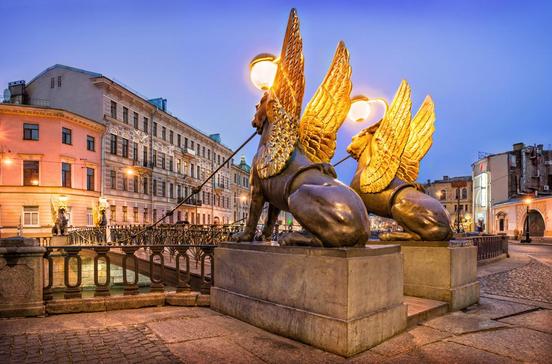 Dieser nur 20 m lange und keine 2 m breite Fußgängersteg ist die wohl originellste der mehr als 500 Brücken des "nördlichen Venedigs". Die 1825-26 errichtete Hängebrücke befindet sich in einer Biegung des Kanals Gribojedowa und wird von vier Greifen mit g