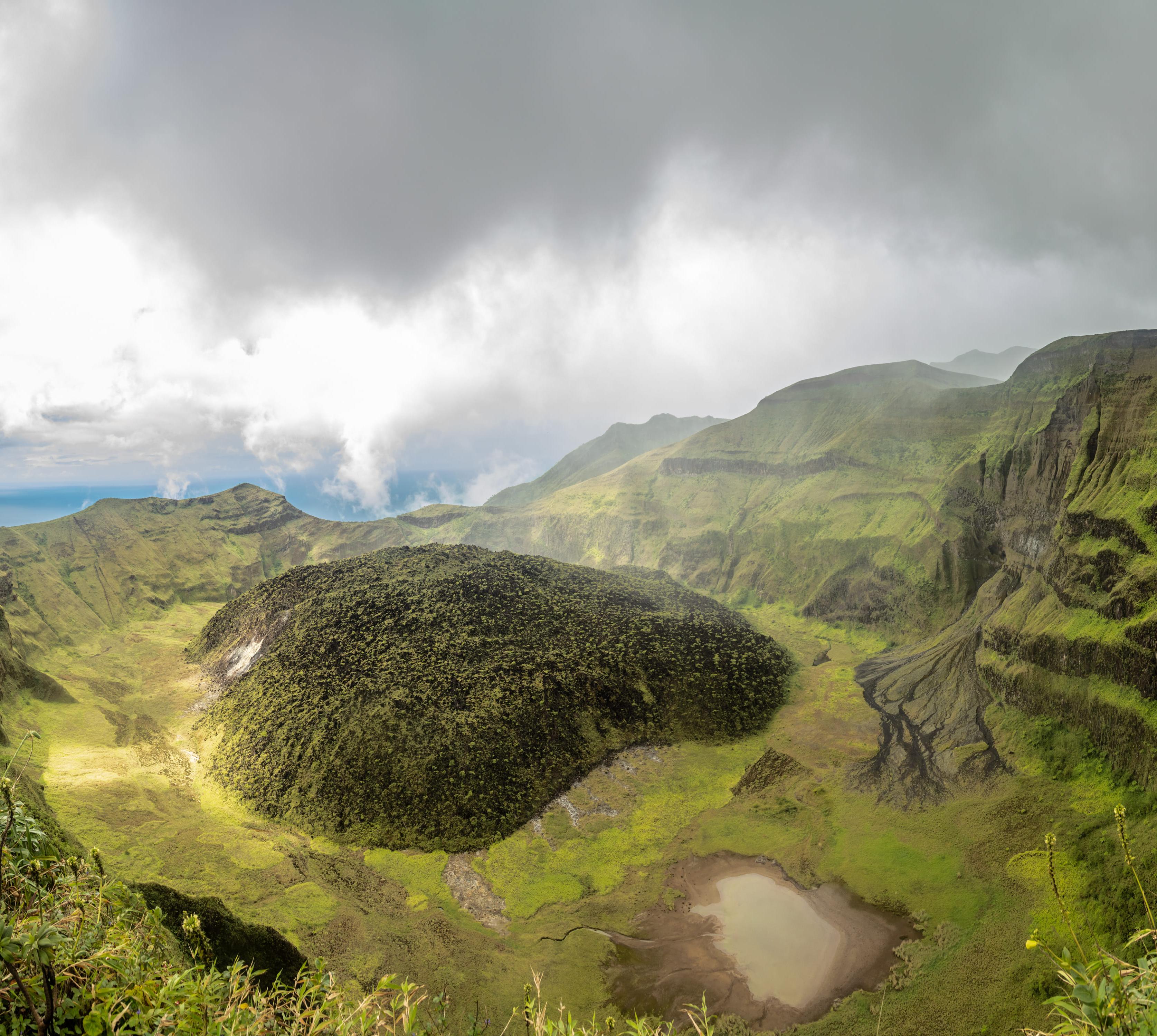 Der walisische Landschaftsgärtner Timothy Vaughn hat das einst heruntergekommene Stück Land in einen umwerfenden Garten mit tropischen Pflanzen und Vögeln verwandelt. Riesige Farnstauden bilden entlang der Wege einen schattenspendenden Baldachin. Im Hintergrund erhebt sich Grand Bon Homme, der 970 m hohe Berg der Insel.