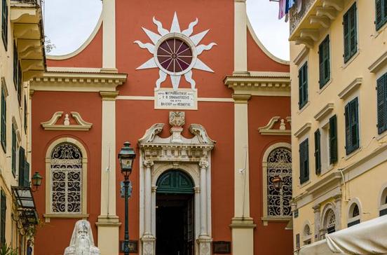 Die von Gläubigen mit wertvollen Weihgaben überhäufte Kirche ist dem Inselschutzheiligen gewidmet. Ihr kostbarster Besitz sind die Gebeine des heiligen Spiridon, eines zypriotischen Märtyrers aus der Zeit um 300.Die Reliquie gelangte 1456 durch Kauf nach Korfu, wo der Heilige im Lauf der Jahrhunderte zahlreiche kleine und große Wunder bewirkt haben soll. Das Kircheninnere wurde im 18.und 19.Jh. ganz im Stil der Ionischen Malschule ausgeschmückt - also mit Deckenmalereien und Ikonen, die nicht mehr in der Tradition von Byzanz stehen, sondern sich ganz an westlichen Vorbildern orientieren. In der rechten Seitenkapelle hinter der Ikonostase steht der mit getriebenem Silber verkleidete Ebenholzsarkophag des heiligen Spiridon. Den ganzen Tag über kommen Gläubige jeden Alters, entzünden eine Kerze, küssen den Sarkophag und schreiben einen Wunsch oder Dank an den Heiligen in ein ausliegendes Buch. Über dem Sarkophag hängen von Gläubigen gestiftete silberne Öllampen. Einige davon sind deutlich als Gaben von Seeleuten und Reedern zu erkennen: Silberne Schiffsmodelle oder Votivtäfelchen mit Schiffsreliefs zieren sie.
