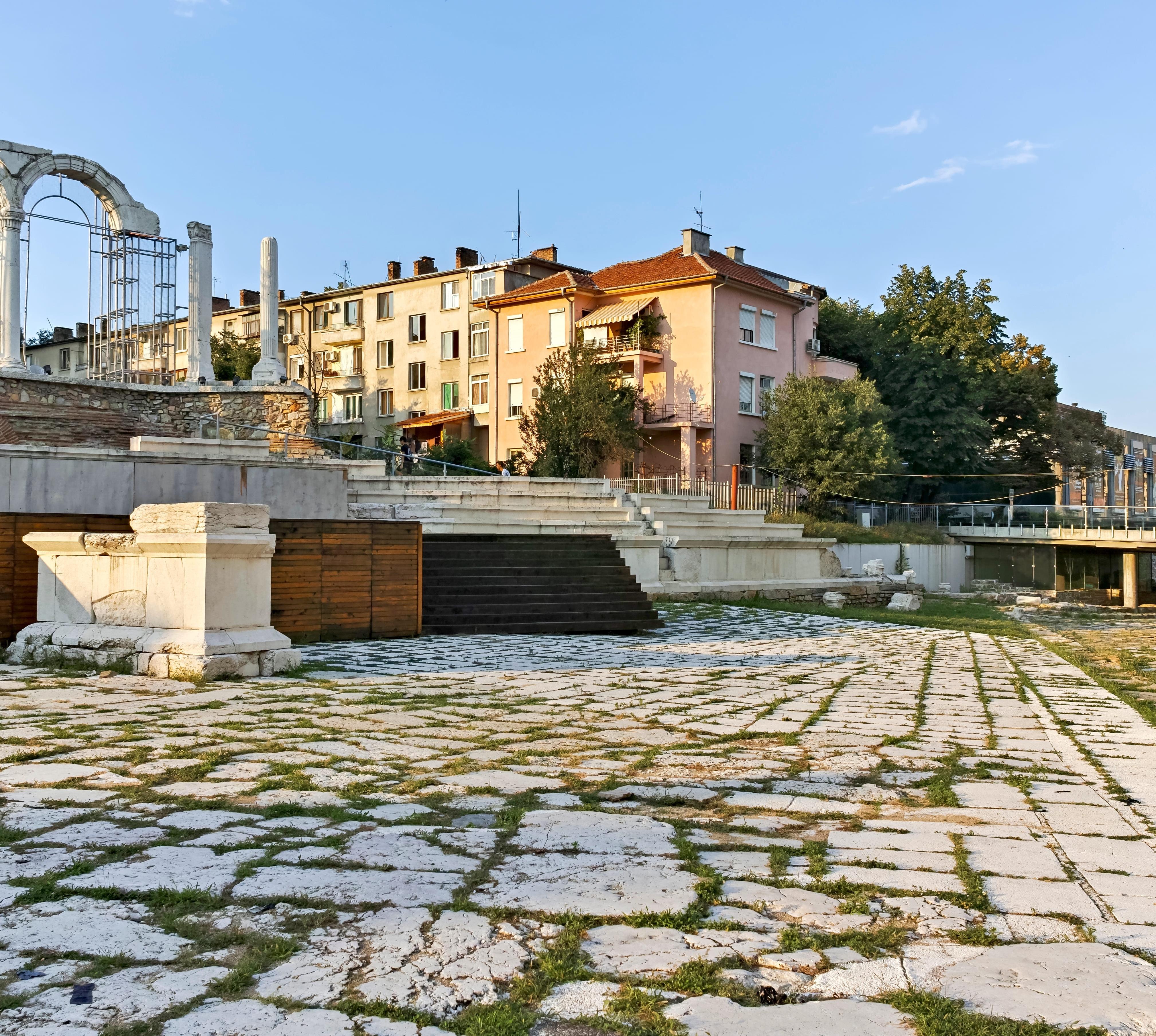 In den ersten nachchristlichen Jahrhunderten diente die nach ihrem Gründer Kaiser Trayan (98–117) benannte Stadt als Augusta Trayana als wichtiges wirtschaftliches und politisches Zentrum in der römischen Provinz Thrakien. Das Bauwerk hat die Form eines Amphitheaters mit zehn Steinreihen, von denen die Zuschauer den Gladiatoren beim Kampf zusahen. Heute sind noch eindrucksvolle Überreste zu sehen. Nördlich schließen die römischen Thermen an. Das antike Forum wird als Bühne für Veranstaltungen genutzt.