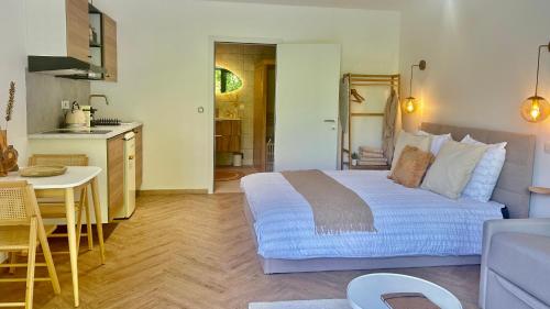 Diese Ferienwohnung mit Klimaanlage besteht aus 1 Schlafzimmer, einem Wohnzimmer, einer voll ausgestatteten Küche mit einem Kühlschrank und einer Kaffeemaschine sowie 1 Badezimmer mit einer Dusche und kostenlosen Pflegeprodukten. In dieser Ferienwohnung werden Handtücher und Bettwäsche zur Verfügung gestellt.