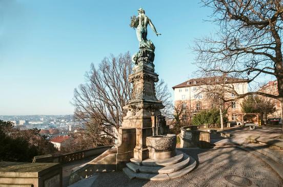 Vom schönen, baumbestandenen Eugensplatz blickt Galatea ins Tal. Die nahezu unbekleidete griechische Sagengestalt, 1890 von Königin Olga gestiftet, entsprach damals keineswegs dem Geschmack der Stuttgarter. Schließlich drohte Königin Olga, die Figur umzudrehen und mit dem blanken Hinterteil auf die Stadt schauen zu lassen - und die Kritiker gaben Ruhe.