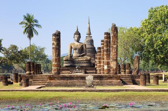 Das bedeutendste und größte Bauwerk ist der Wat Mahathat mit einem beherrschenden Chedi auf einem Reliefsockel, Säulenreihen und vielen Buddhastatuen, die teilweise restauriert wurden. Ganz in der Nähe befinden sich die drei Prangs des Wat Sri Sawai. Im Norden des einst ummauerten Stadtkerns erhebt sich auf einer Insel in einem künstlichen Teich der Chedi des Wat Phra Phai Luang. Die mit 11 m höchste Buddhastatue sitzt hinter den hohen Mauern und hölzernen Flügeltoren des Wat Sri Chum gleich nebenan. Die Tempel des Parks kann man gut mit dem Fahrrad erkunden, z.B. auf einer informativen geführten Mountainbiketour.