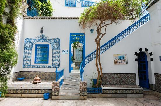 Sidi Bou (TGM-Station Sidi Bou Saïd), auf einem Felssporn zwischen Carthage und La Marsa gelegen, ist ein maurisches Bilderbuchstädtchen. Wohl kein Ort in Tunesien besitzt so viel mediterranen Zauber. Die schmale, steil bergauf führende Hauptstraße endet am berühmten Café des Nattes, das 1914 auf August Mackes Aquarell "Blick auf eine Moschee" verewigt wurde. Bevor du dir hier thé à la menthe und eine chicha gönnst, lohnt der Aufstieg durch die schmalen Gassen des Orts hinauf zum höchsten Punkt, wo sich Tische und Stühle des Cafés Sidi-Chaabane wie in einem Theater rund am Hang entlang staffeln und einen fantastischen Ausblick über die Bucht bieten. Beim Bummel durch den Ort fallen die mit Eisennägeln geschmückten Portale der Häuser auf: Sie sind das einzige Dekor und je nach Ausführung alleiniges Indiz für den Wohlstand des Hausbesitzers. Zu diesem Understatement nach außen passt der Palast Dar Ennejma Ezzahra nicht. Orientalischen Prunk, umgeben von üppigen Gärten, wünschte sich sein Besitzer, Baron Rodolphe d'Erlanger (1872-1932), als er sich Anfang des 20.Jhs. in Sidi Bou niederließ und sich dafür einsetzte, den Ort unter Denkmalschutz zu stellen. Der Palast ist heute ein Musikinstrumentemuseum (Centre des Musiques Arabes et Méditerranéennes). Ab und an finden in den Räumlichkeiten Jazzsessions oder Maaloufabende statt. Einen traditionellen, wohlhabenden Haushalt können Besucher im Dar el-Annabi besichtigen. In dem Anwesen aus dem 18.Jh. reiht sich Zimmer an Zimmer. Durch Originalmobiliar, traditionelle Kleidung, Koranhandschriften und Schmuck fühlt man sich nicht wie in einem Museum, sondern in das Leben einer klassichen tunesischen Familie versetzt.