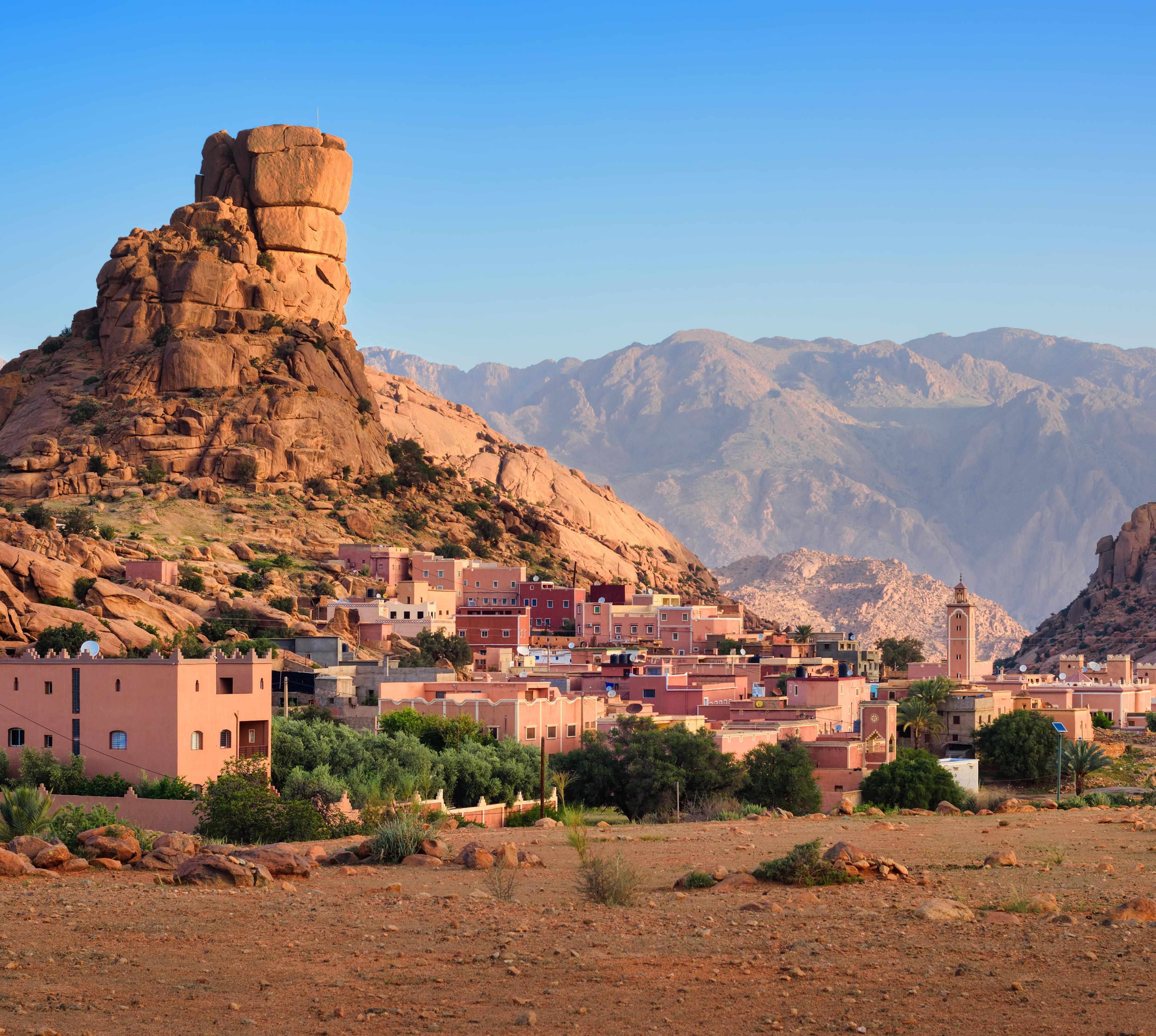 Bizarr erodierte Granitfelsen schimmern vor allem in den frühen Abendstunden in allen Rottönen. Die Häuser der Hauptstadt des Anti-Atlas, Tafraoute (6000 Ew.), sind außerdem in Rosa, Rot, Ocker und Orange gehalten. Stell dich also auf ein wahres Farbspektakel ein, wenn du hierher reist.