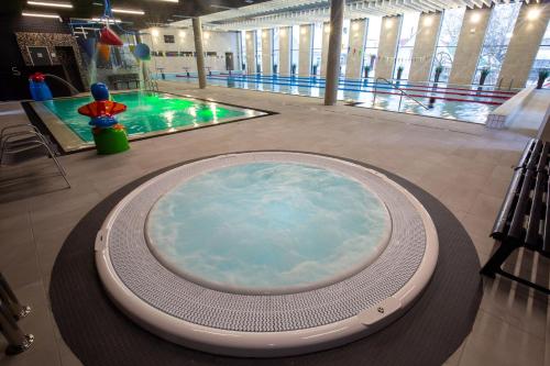 Various types of saunas, a hot tub, a children’s pool, and a seasonal outdoor pool (open in the summertime) are available in the Aqua Spa. Beauty treatments are also available in the Beauty & Wellness center.