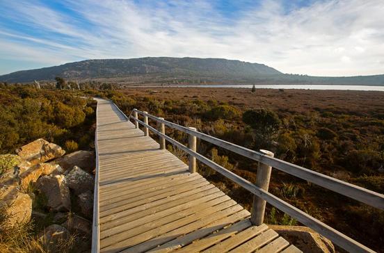 Der rund 65 km lange Overland Track von Cradle Mountain bis zum Lake Saint Clair führt in etwa fünf Tagen durch Bergregionen, Hochmoore, uralte Regenwälder und tiefe Täler mit spektakulären Wasserfällen.