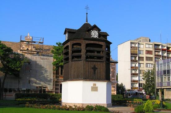 Vom 1763 errichteten hölzernen Uhrenturm erklingt zu jeder vollen Stunde ein Glockenspiel.