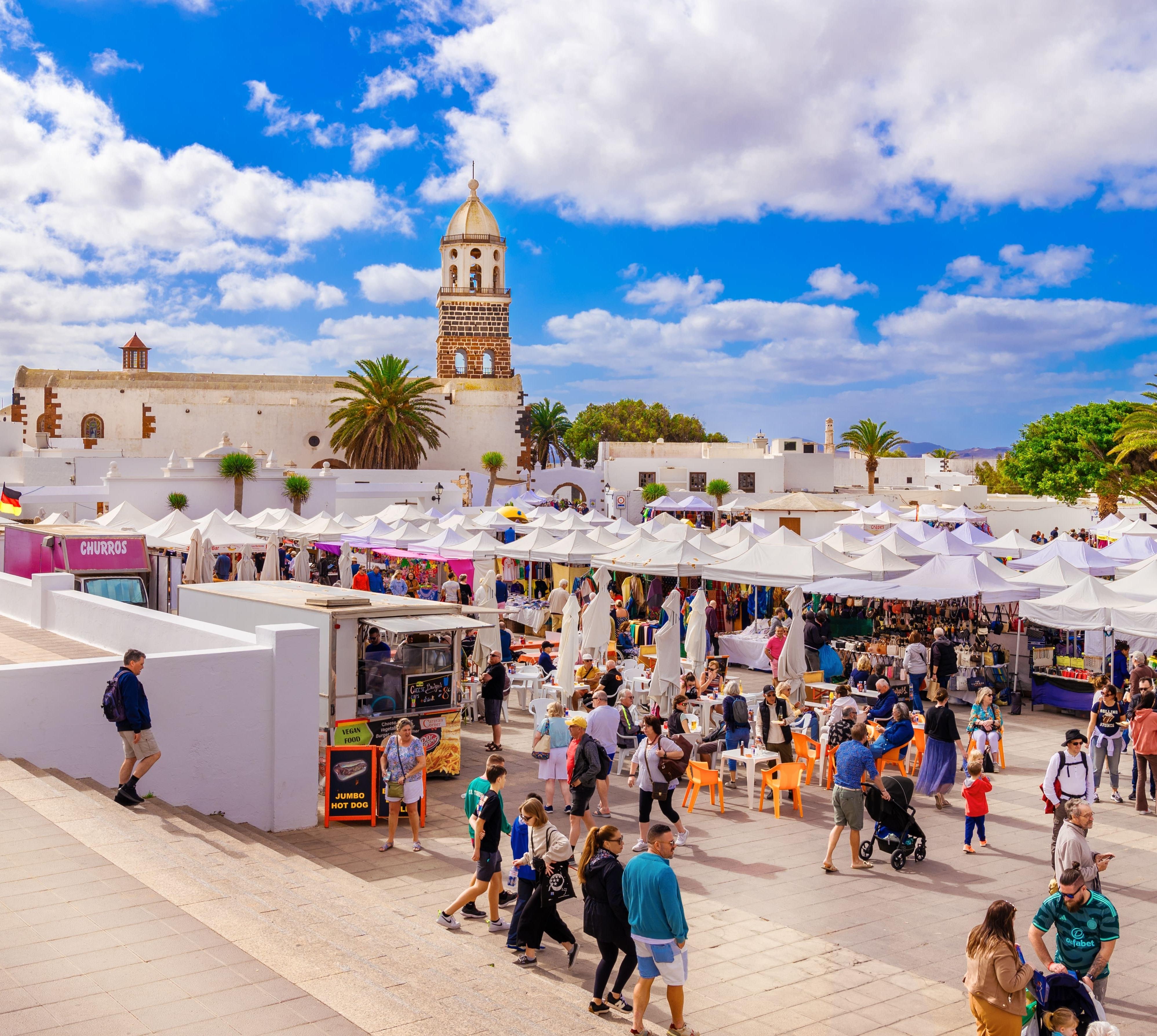 Heute lebt Teguise zwei Leben. Wochentags ist es gemütlich: Zu den Einheimischen und den vielen hier lebenden Ausländern gesellen sich Tagesausflügler, die die stilvollen bis szenigen Lokale bevölkern und in den netten Läden stöbern. Sonntags dagegen platzt Teguise aus allen Nähten. Dann ist Markttag. Der mercadillo ist eine der großen Attraktionen Lanzarotes. Zu Tausenden werden die Urlauber in Bussen herangekarrt, Dutzende von Händlern verhökern Nippes aus aller Welt. Folkloregruppen spielen zur Unterhaltung auf. Straßen und Plätze, ja der ganze Ort gleicht nun einem Basar. In den Bars rangeln die Besucher um Getränke, die an diesem Tag oft teurer sind, als auf der Insel üblich. Die Gran Mareta, der weite Platz über den Zisternen hinter der Pfarrkirche, steht rappelvoll mit Imbissbuden. Obwohl der Trubel mit authentischem Inselleben nichts zu tun hat, ist der mercadillo doch für viele ein Erlebnis, denn ein solch turbulentes Treiben gibt es nirgends sonst auf Lanzarote. Erst Sonntagabend kehrt Ruhe ein – und montags geht alles wieder seinen gemütlichen Gang.