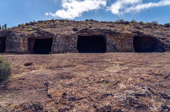 Der unscheinbare "Berg der vier Tore" südlich von Telde war ein Kultort der Altkanarier mit vier massiven, rechteckigen Eingängen sowie Opferaltar und Versammlungsplatz. Auf seiner Rückseite befinden sich Wohnhöhlen und Felszeichnungen.