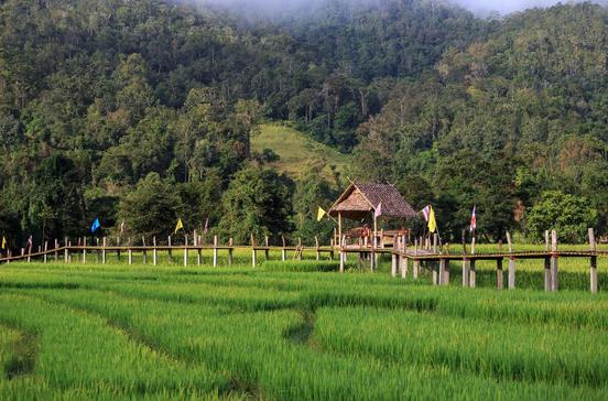 Ein einfacher, teils etwas ramponierter Bambusmattenpfad schlängelt sich durchs Reisfeld, das in der Regenzeit lindgrün und kurz vor der Erntezeit goldgelb leuchtet. Die 800 m lange Kho Ku So (Opfergabenbrücke) verkürzt den Mönchen des abgelegenen Tempels Wat Huay Kai Kiri ihren Weg zum Almosensammeln in die Dörfer. Es gibt sogar ein Café für Besucher, dort kann man das beste Fotomotiv abwarten oder sich im Bogenschießen üben.