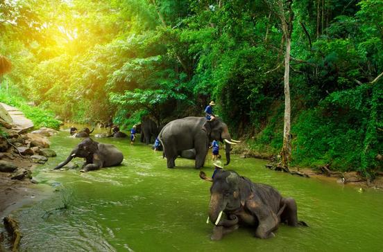 In der Umgebung von Chiang Mai gibt es Elefantencamps, wo die grauen Riesen zeigen, was sie gelernt haben: Sie stapeln Baumstämme, spielen Fußball und malen sogar Bilder. Und sie drehen mit den Besuchern auf ihrem Rücken eine Runde durchs Gelände.