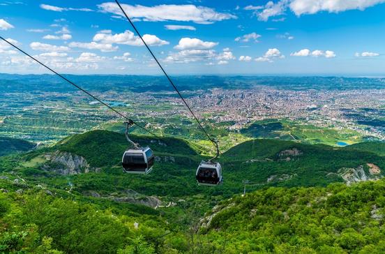Eleganter entschwebt keiner der Stadt als mit der Seilbahn auf den Dajti und in den gleichnamigen Nationalpark. Oben warten kühlere Luft, spektakuläre Ausblicke, Spazier- und Wanderrouten, ein Hochseilgarten sowie Ausflugsrestaurants. Minigolf und ein Kinderspielplatz sind ebenfalls vorhanden. Von der Bergstation gelangt man recht einfach auf den Gipfel (4 km, 500 Hm). Schon der Vorgipfel auf 1534 m bietet einen unfassbaren Blick über Tirana bis nach Durrës und das Mittelmeer.