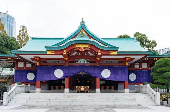 Fürst Ōta Dōkan ließ hier im 15.Jh. einen Schrein für Oyamakuni no kami, die Schutzgottheit von Edo, errichten. Unter dem Patronat der Tokugawa-Shōgune wurde er der populärste aller Schreine in Edo, das Schreinfest Sannō Matsuri galt als "Fest ohnegleichen". Noch heute wird es Mitte Juni gefeiert. Höhepunkt ist die Shinto-Parade, eine Prozession von kaiserlichen Sänften, an der rund 400 Personen in Kostümen im Stil der Heian-Zeit (9.-12.Jh.) teilnehmen - allerdings nur in geraden Jahren. Ein Gebet am Hie-Schrein soll vor Frühgeburten und Verkehrsunfällen schützen - eine eigenwillige Kombination. Beim Schutz der eigenen vier Wände war die Gottheit weniger erfolgreich: Sie fielen im Zweiten Weltkrieg in Schutt und Asche. 1959 wurden sie durch einen Neubau ersetzt.