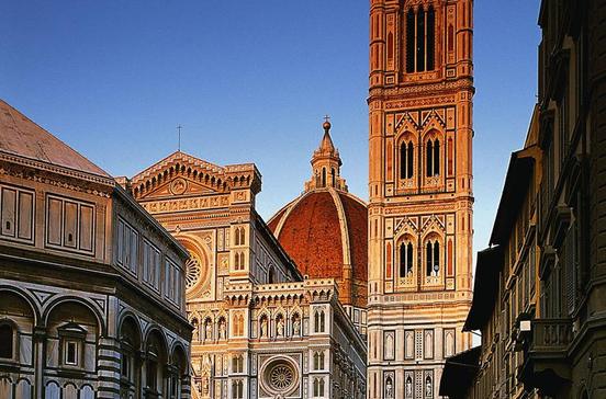 Der Dom mit seiner mächtigen Kuppel bestimmt weithin die Silhouette der Stadt. Sein Bau war gewissermaßen ein später Triumph, denn Pisa, Lucca, Pistoia, Prato und Siena hatten alle schon ihre prunkvollen Kathedralen, als sich die Stadtregierung 1296 endlich zum Bau einer neuen Kathedrale für Florenz durchrang und Arnolfo di Cambio mit ihrer Errichtung beauftragte. 1368 war der mächtige Bau vollendet - allerdings fehlte noch die Domkuppel, sie wurde erst in den Jahren 1420-34 von Filippo Brunelleschi aufgesetzt. Der vorgesehene Kuppeldurchmesser von über 45 m warf bisher nie da gewesene Konstruktionsprobleme auf. Brunelleschis Konzept beruhte im Wesentlichen darauf, dass einander zugeneigte Körper sich gegenseitig stützen, und so baute er einen geschlossenen Kuppelring auf den anderen. Wer es sich zutraut (Achtung: Einbahnstraße - umkehren nicht möglich!), die 463 Stufen bis zur Laterne durch das Kirchenschiff und die Doppelwand der Kuppel hochzusteigen, nimmt denselben Weg, den einst die Bauarbeiter zurücklegten. Hier bieten sich interessante Einblicke in das "Innenleben" der Kuppel - und am Ende ein toller Blick über die Stadt! Der Dom von Florenz ist die viertgrößte Kirche der Christenheit. Viele namhafte Florentiner Künstler haben zu seiner Ausschmückung beigetragen. Sehr schön sind die bunten Rundfenster an der Basis der Kuppel sowie die grandiosen Fresken des Weltgerichts, mit denen Giorgio Vasari und Federico Zuccari die Kuppel ausmalten. Die bunt glasierten Terrakottareliefs über den Eingängen der beiden Sakristeien stammen, wie auch die Bronzetür zur Neuen Sakristei links vom Hauptaltar, von Luca della Robbia. Die berühmten Sängerkanzeln von Donatello und Luca della Robbia sowie die Pietà von Michelangelo sind heute im Museo dell'Opera di Santa Maria del Fiore zu sehen. Eine Treppe rechts vom Haupteingang führt hinab in die 1966 freigelegten Reste der frühchristlichen Vorgängerkirche Santa Reparata, in der sich u. a. das Grab Brunelleschis befindet. Ein dort aufgefundenes Skelett wurde eindeutig als das von Giotto identifiziert, den man daraufhin neben Brunelleschi beisetzte.