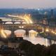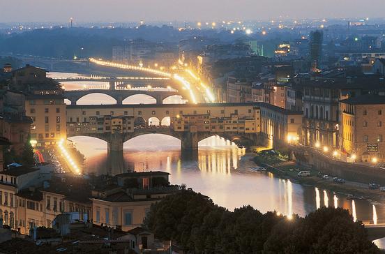 Die "Alte Brücke" ist eines der Wahrzeichen von Florenz. Schon zu Zeiten der Etrusker bestand ein Flussübergang, in römischer Zeit verlief hier die Via Cassia, einer der wichtigsten Handelswege Roms gen Norden. Die jetzige Brücke, die den Fluss an seiner schmalsten Stelle überquert, wurde 1345 von Neri di Fioravanti oder Taddeo Gaddi errichtet. Charakteristisch sind die überhängenden Brückenläden. Von 1422 bis 1593 betrieben hier hauptsächlich Schlachter ihr Geschäft. Als die großherzogliche Familie in den Palazzo Pitti gezogen war, störte sie der Geruch, und Ferdinand I. verfügte, dass fortan nur noch Gold- und Silberschmiede auf der Brücke ihr Handwerk ausüben durften. Damit er trockenen Fußes vom Palazzo Vecchio zum Palazzo Pitti gelangen konnte, beauftragte 1565 Cosimo I. seinen Architekten Giorgio Vasari mit dem Bau des Corridoio Vasariano, der über den Läden der Ostseite entlangläuft. Der Ponte Vecchio blieb als einzige Brücke beim Rückzug der Deutschen von der Sprengung 1944 verschont. Stattdessen wurde sie mit den Trümmern umliegender zerstörter Gebäude versperrt. Heute ist die Brücke mit ihren Juwelierläden einer der Anziehungspunkte der Stadt.
