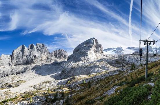 Die Faszination der Marmolada, der Königin der Dolomiten und mit 3343 m auch ihr höchster Gipfel, lässt sich nur unzureichend beschreiben. 15 km westlich von Alleghe liegt der gewaltige Felsklotz mit der blau-weißen, vergletscherten Eiskappe. Im Winter tummeln sich auf den schneesicheren Nordhängen die Skifahrer, im Sommer lässt man sich mit der Seilbahn bis zum Gipfel der Punta Rocca bringen.