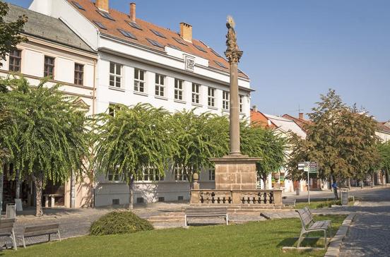 Von der Burg aus ist dieser zentrale Stadtplatz mit seinen Fassaden vorwiegend aus dem 18.Jh. besonders schön zu überblicken. Die Pestsäule in seiner Mitte wurde 1712 aufgestellt. Blickfang am Platz ist die doppeltürmige Kirche des Piaristenordens; hinter ihren ockergelben Mauern verbirgt sich barocke Pracht. Der Stadtturm wird auch „Türkentor” genannt; er ist allerdings nur im Sommer zu besichtigen. Die dahinterliegende Synagoge ist eine der größten noch erhaltenen des Landes. Sie lässt auf eine einst bedeutende jüdische Gemeinde schließen; der Kuppelbau entstand 1911 in orientalisierendem Stil.