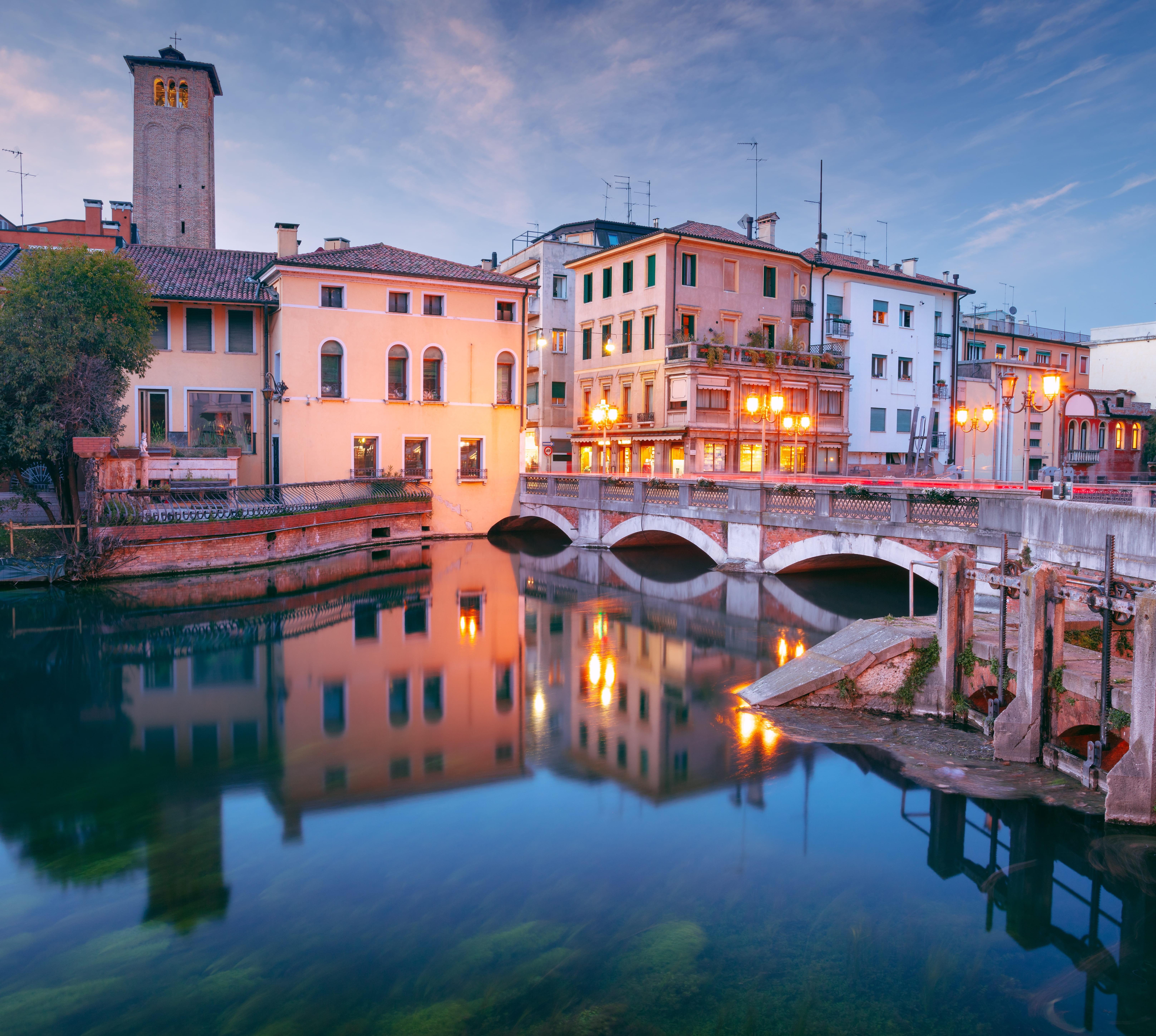 Von grün umwucherten Flüssen und Kanälen durchzogen, präsentiert sich Treviso (84 000 Ew.) wunderbar beschaulich. Dazu kommen mittelalterliche Palazzi, ein Dom mit einem Altarbild von Tizian und eine beachtliche Gemäldesammlung im Exkonvent Santa Caterina. In der alteingesessenen Trattoria Toni del Spin isst man Stockfisch (baccalà) oder den gegrillten Radicchio Trevisano, die Spezialität der Stadt.
