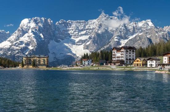 Der Lago di Misurina, 17 km nordöstlich von Cortina vor der Kulisse der Drei Zinnen gelegen, ist eins der Klischeebilder der Dolomiten und entsprechend besucht. Von hier führt eine viel befahrene Mautstraße zur Auronzohütte direkt am südlichen Fuß der Drei Zinnen.